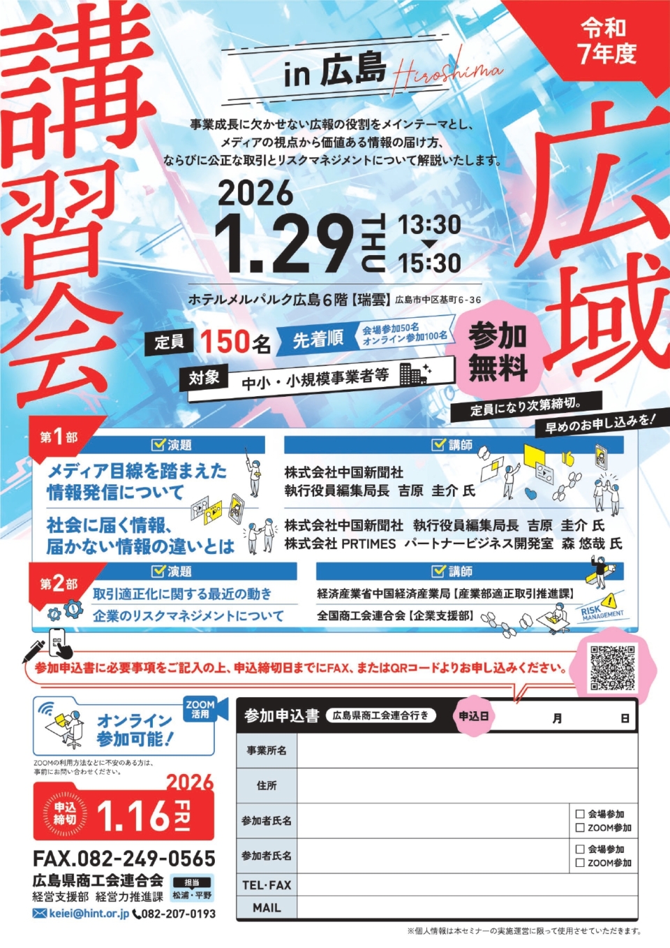 【主催】広島県商工会連合会 FAX:082-249-0565 MAIL:keikei@hint.or.jp QRコードからもお申込みいただけます。 |