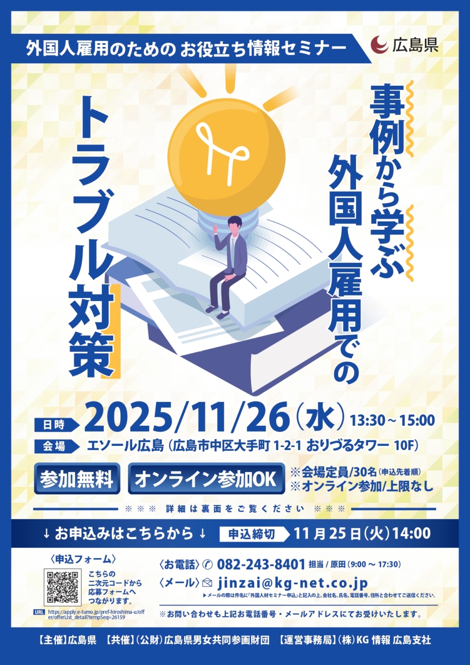 【主催】広島県 【共催】(公財)広島県男女共同参画財団 【運営事務局】(株)KG 情報 広島支社 TEL:082-243-8401 |
