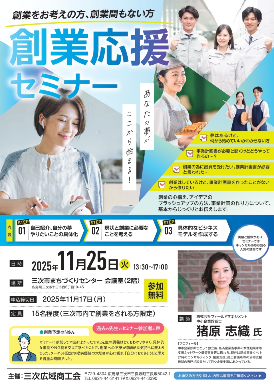 三次広域商工会 TEL:0824-44-3141 FAX:0824-44-3390 申込:https://docs.google.com/forms/d/e/1FAIpQLSfUFTGsjP_GjJggTlC2Tq5xMZwbgMsZEbMx1GB-qtlzBV3-7Q/viewform |